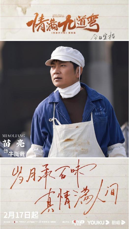 2月17日,由刘家成执导,韩东君、热依扎领衔主演,陈瑶、萨日娜、种丹妮、鲍晓、苗亮等主演的年代情感剧《情满九道弯》在央视八套首播,并在优酷同步播出。该剧是《情满四合院》的姊妹篇,曾在《情满四合院》以“刘光天”这一角色给观众留下深刻印象的演员苗亮,此次在剧中饰演了反派一号牛挺贵,具体表现值得期待。